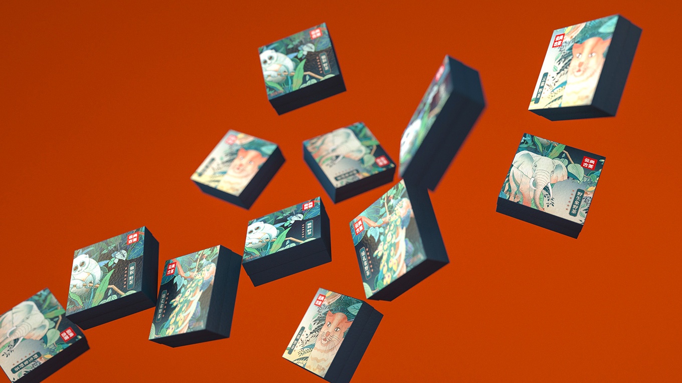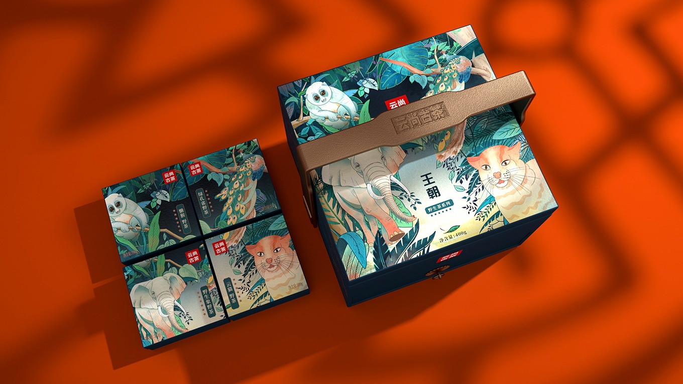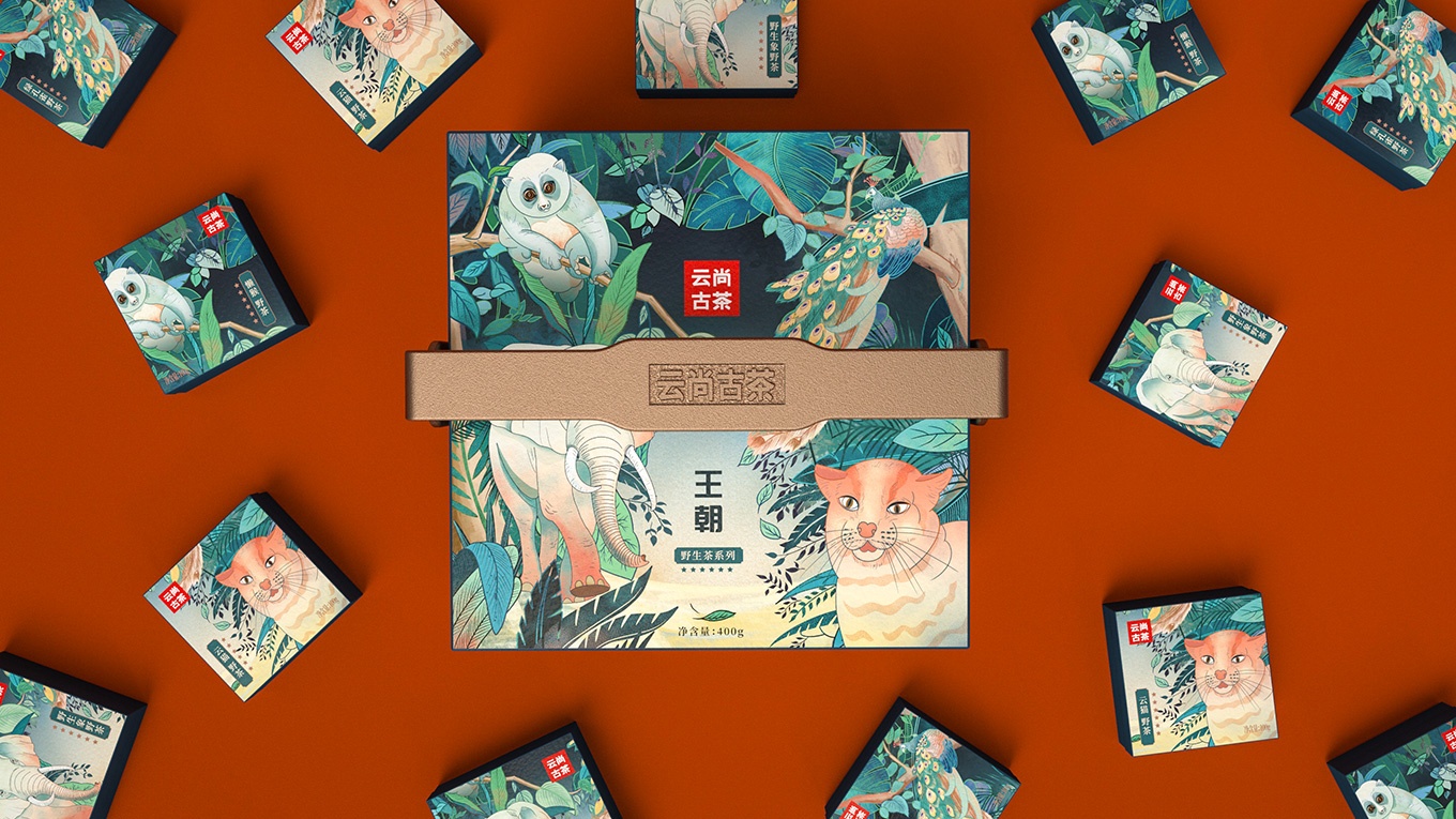 古茶因為生長在原始森林,所以生長環境較為苛刻,產量更為稀缺。產品的稀缺,可以用相應的和古茶共生的保護動物來表現。所以我們選擇了用綠孔雀、野生象、懶猴、云貓這些有代表性的云南珍稀保護動物進行包裝主畫面設計。用原生態的自然元素表現出在原始森林中珍稀野生動物與古茶共生的畫面。在一片綠色的原始森林中,有活力的原始動物、靜謐生長的古茶,交相映襯,使得整個畫面安靜又具活力。而且這樣的設計不僅可以讓人從生態環境角度感受到產品的品質,也可以體現出云尚古茶的獨特和珍貴之處。讓人回味無窮。