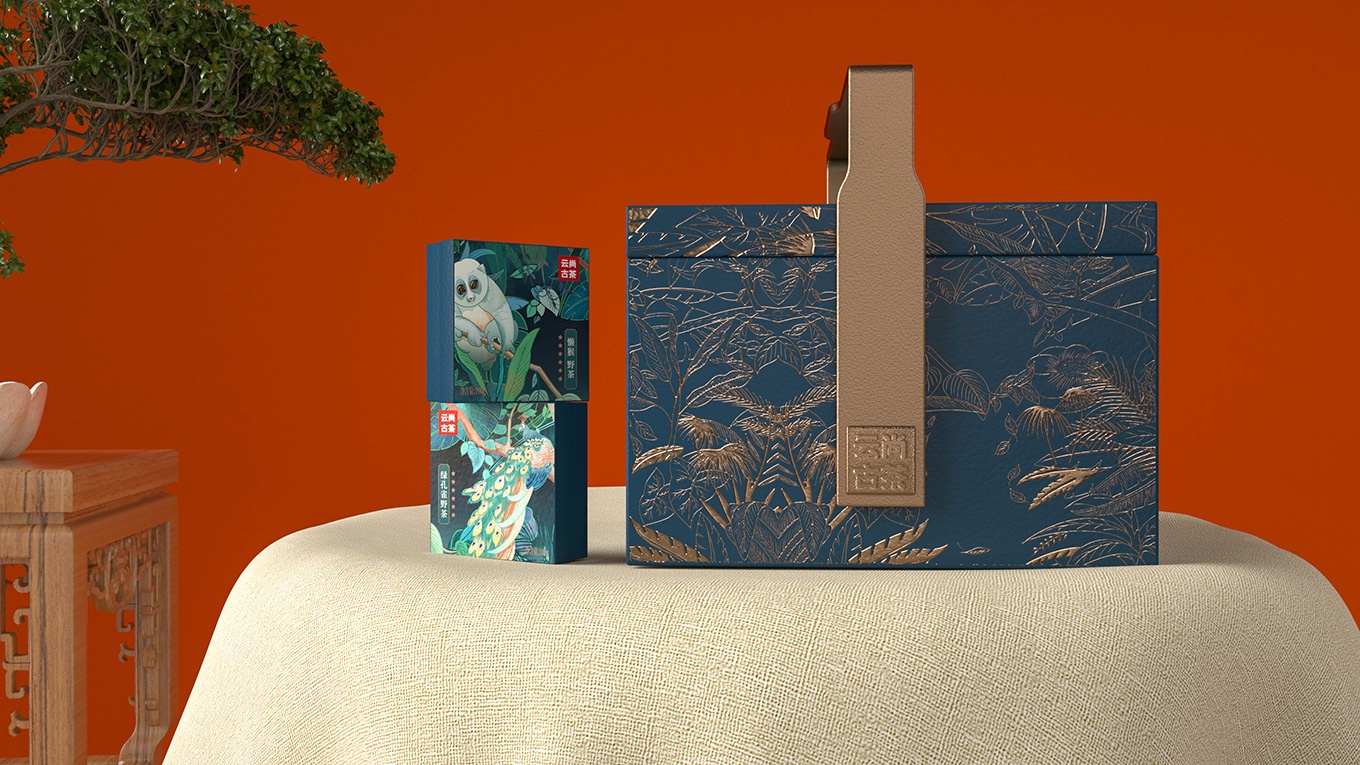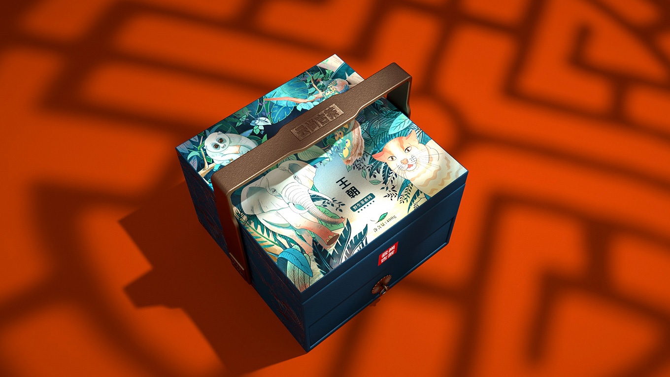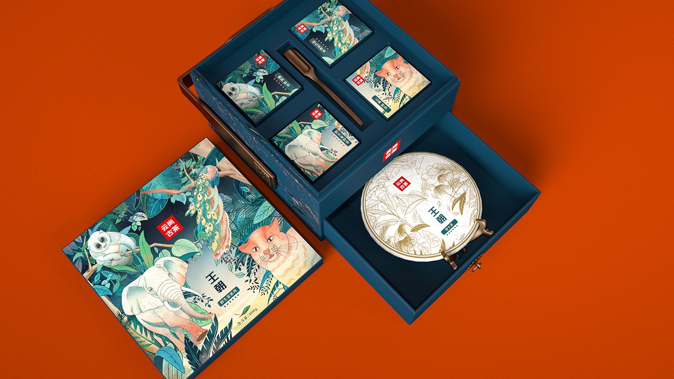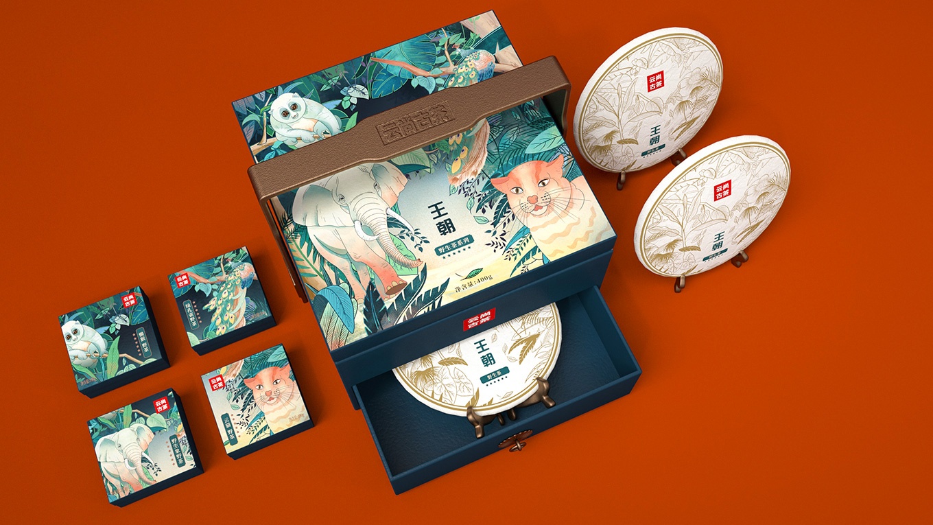 古茶因為生長在原始森林,所以生長環境較為苛刻,產量更為稀缺。產品的稀缺,可以用相應的和古茶共生的保護動物來表現。所以我們選擇了用綠孔雀、野生象、懶猴、云貓這些有代表性的云南珍稀保護動物進行包裝主畫面設計。用原生態的自然元素表現出在原始森林中珍稀野生動物與古茶共生的畫面。在一片綠色的原始森林中,有活力的原始動物、靜謐生長的古茶,交相映襯,使得整個畫面安靜又具活力。而且這樣的設計不僅可以讓人從生態環境角度感受到產品的品質,也可以體現出云尚古茶的獨特和珍貴之處。讓人回味無窮。